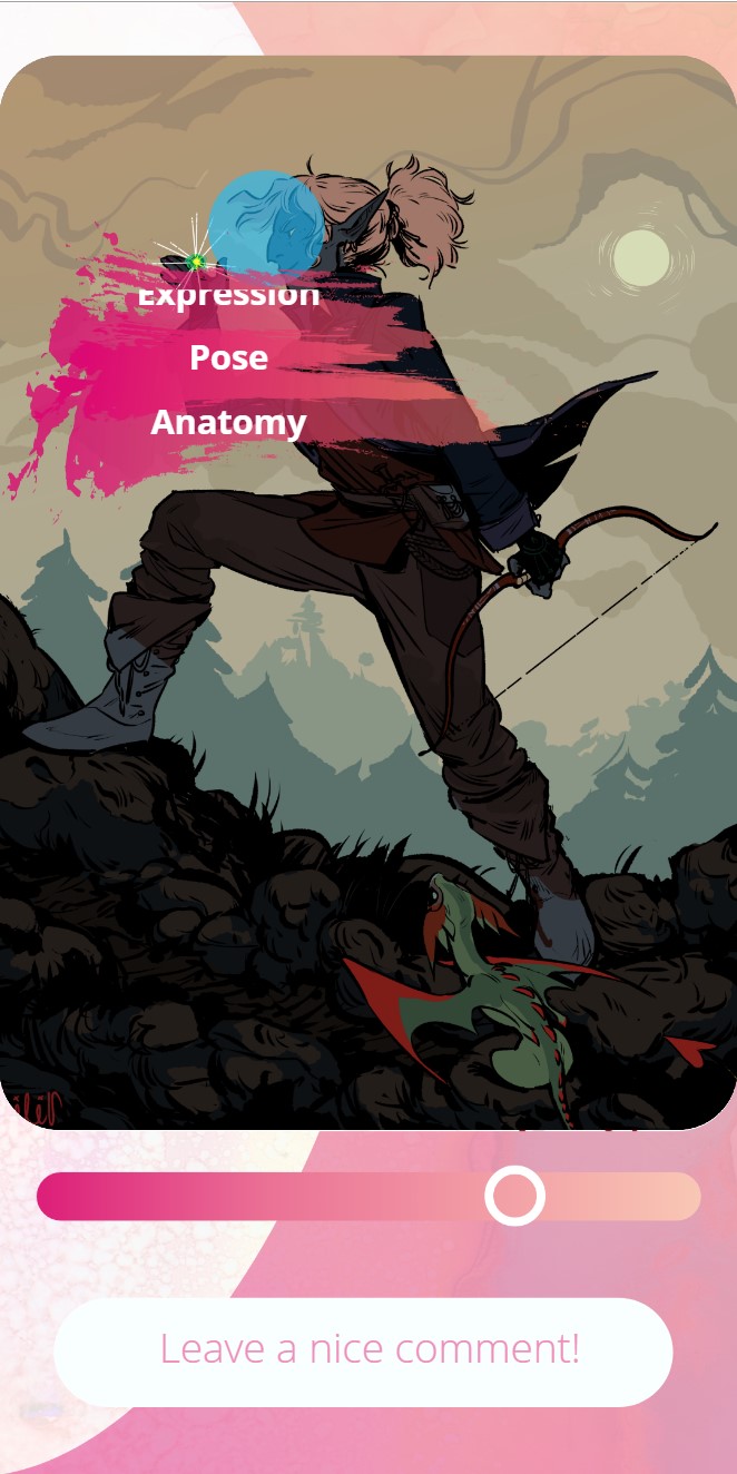 To make the application make use of the opportunities a mobile platform provides, I came up with a “tagging” method that lets people visually document what they like in their own work. Instead of writing, the user can hold their finger on a photo to visually tag the areas of the artwork they like, and then choose a suitable “tag” title for it. For example – if the user is happy with how a character’s facial expression tuned out, the user can visually mark the facial area in the artwork, and then choose “expression” as the tag.