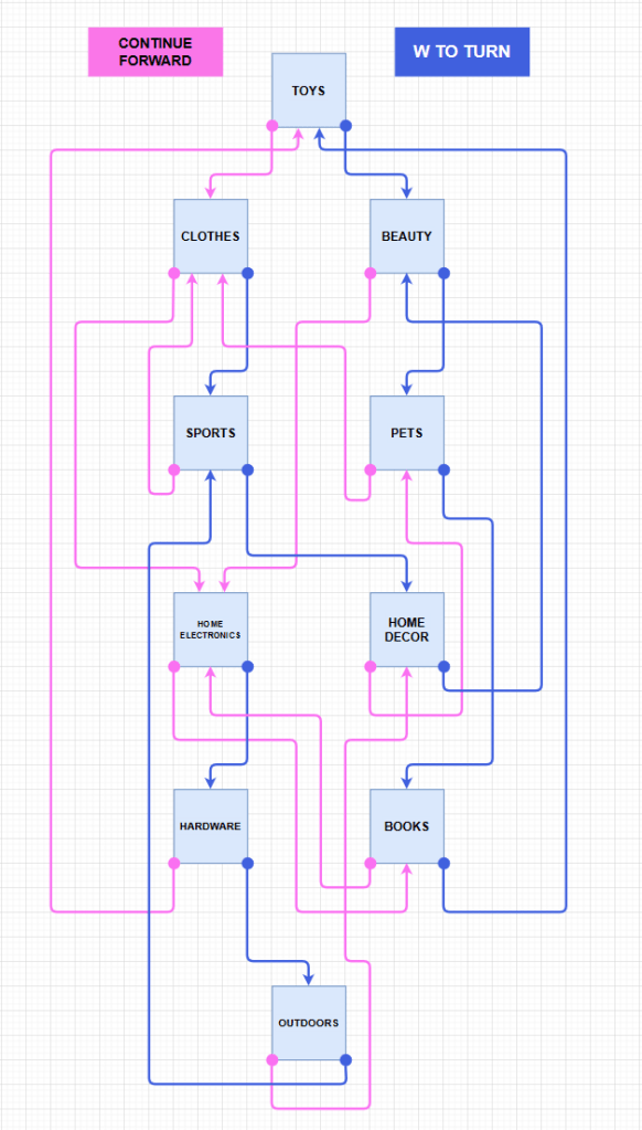 To instruct the player I created store signs that showcase the controls, and also give an indication of the next department – allowing the player to play a memory game on which departments they have already crossed in their journey to find mom.
