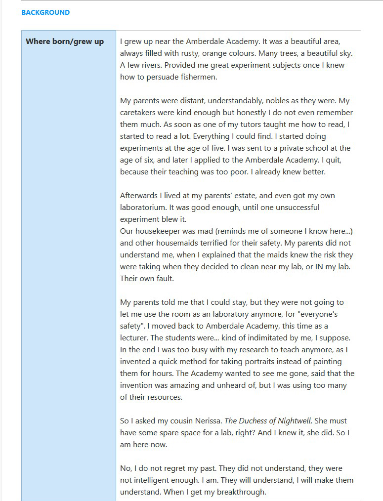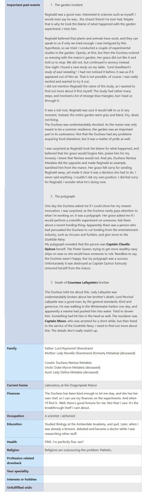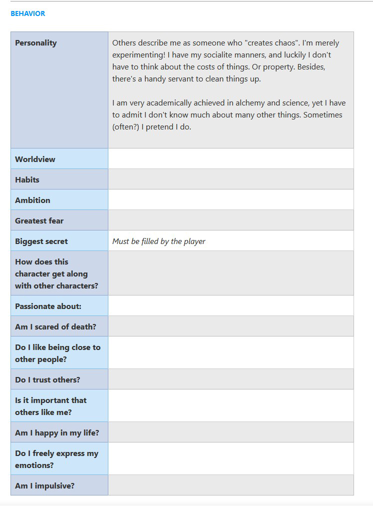 Example: Part of a character sheet “Dr. Shelley Silverstrand”. In addition to the background details, relationships and personality, some details were left empty to give the player agency to fill in and build their own characteristics.