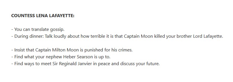Example: Part of a character sheet “Captain Milton Moon”. Each character sheet had a section that explains who that character knows and what kind of relationships they have with others.