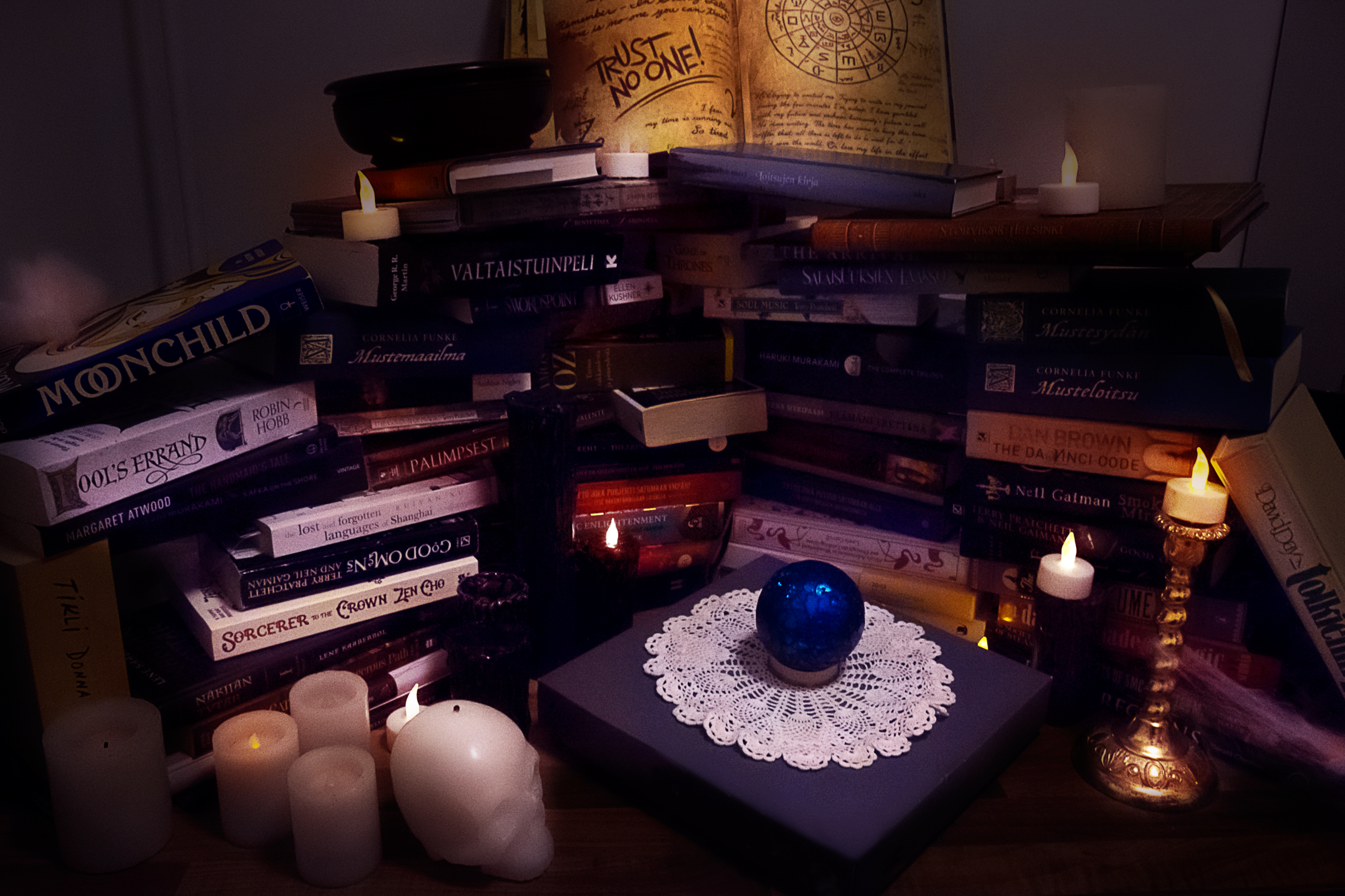 Some of the clues came from the players without them knowing about it beforehand. E.g. the jester, kept reciting a seemingly non-relevant story for entertainment. However, in one clue path the players find cards that state actions. The correct order for the action cards was found from the jester’s story. “Whisperer in darkness, found a curious colour, was stalked by shadows, bargained for books, lost their heart, is resting in peace. Found a new faith: even death may die.”