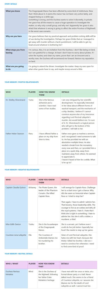 When writing the story, I incorporated some player characters to the main storyline for extra tension. Additionally, I established inter-character connections to provide all players something to discuss with each other, and ensured that all characters have positive, negative and neutral relationships with others.