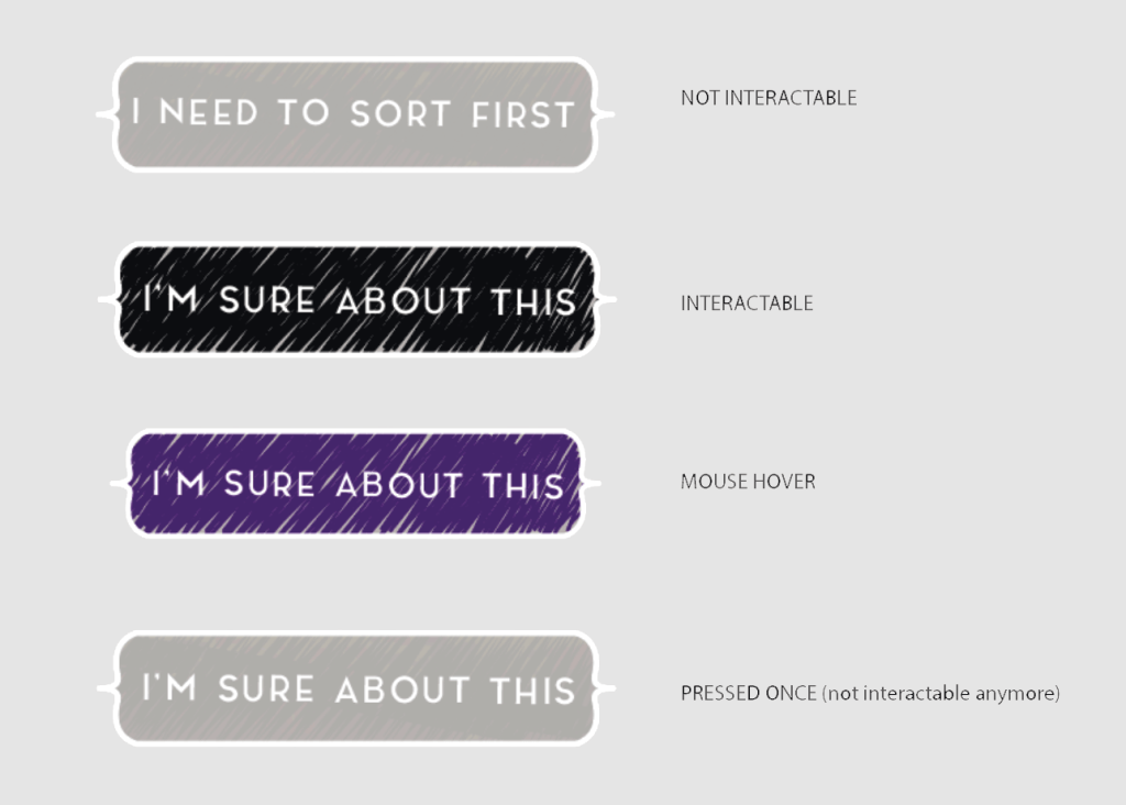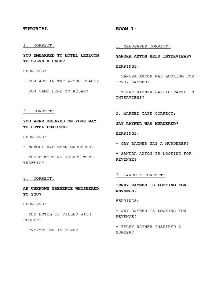 As the mystery of the narrative unravels through the clues the player picks up and sorts to the correct order, the correct answers needed to explain the story piece efficiently and independently, yet still make sense within the context of the answers from other rooms. The wrong answers – herrings – are based on details mentioned within the dialogue heard inside the same room, but are not entirely true. The herrings were iterated multiple times based on play-testing feedback in order to adjust the difficulty of those.