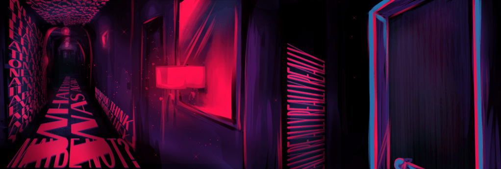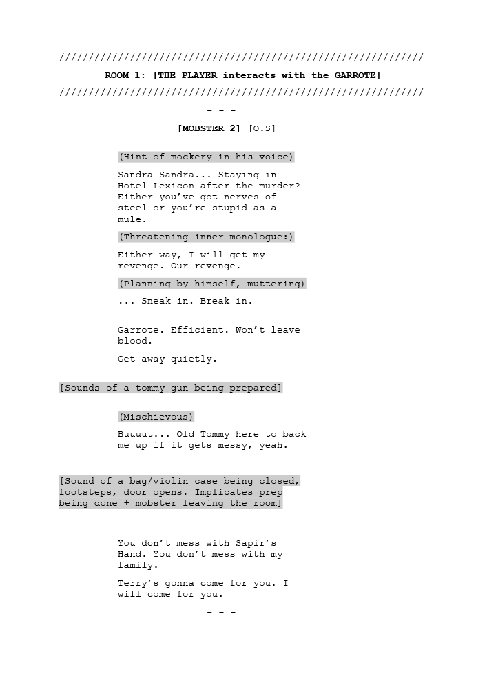 In Words Left Unsaid, the player needs to find evidence pieces from four different rooms, one at a time. Each evidence piece plays a flashback that unravels the case a bit, after which the monster spawns phrases on the walls. The player has to pick the correct phrase that corresponds to what happened in the audio log of the evidence piece. After listening through all evidence pieces within the room, the player has to sort them in their notebook according to the order of the events, and then proceed to the next room.