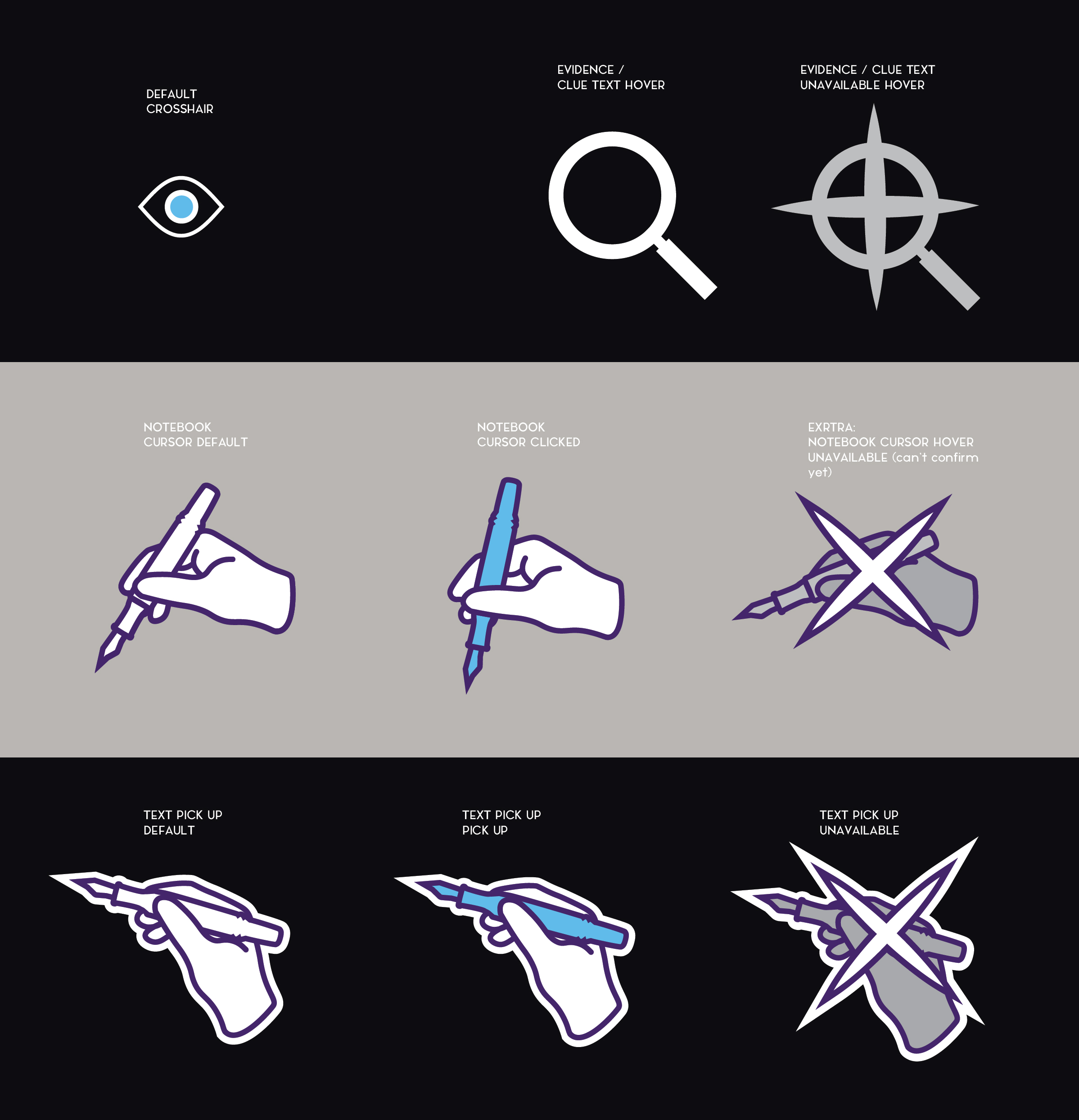 I designed the following cursors and UI elements to provide visual feedback for the player when an action regarding the clues on the walls or in the notebook is available, unavailable or the player has interacted with it.