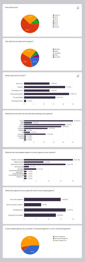 Even during a short development time, I conducted a short survey in order to get an understanding of players’ expectations regarding horror games and narratives with mystery. Although the game’s genre changed a bit during iterations, the survey results were considered in the outcome.